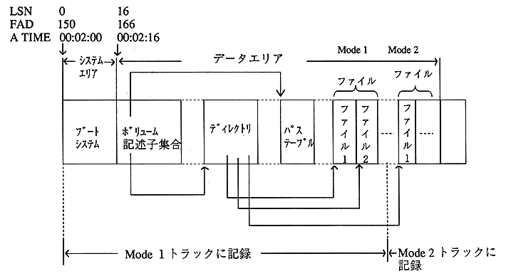 The volume descriptor set, directory, and path table for describing the disk volume / file structure are recorded at the top of the data area. (Figure 3.1)
