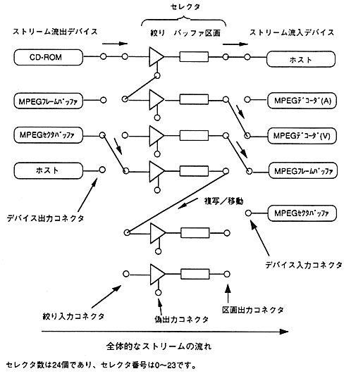 [Description of each part] (A) Device: Generates and absorbs a stream. (Stream outflow / inflow device) (B) Selector: Consists of an aperture and a buffer section, and selects a stream. (C) Aperture: The stream is separated according to the set conditions. (Matches / does not match the conditions) (D) Buffer section: Stores the stream and releases / deletes data according to external requests.
