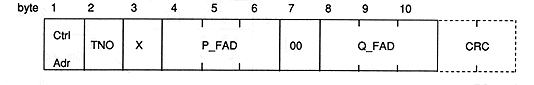 Ctrl Adr: CONTROL / ADR byte TNO: Track number (binary value, not BCD) X: Index number (binary value, not BCD) P_FAD: Track time (frame address format with track head set to 0) Q_FAD: Absolute time (frame address format with 00:00:00 as 0)