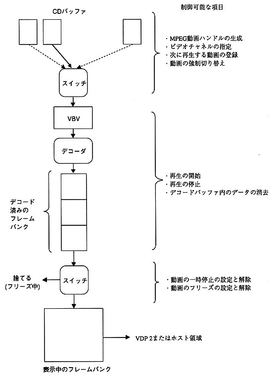- MPEG video data is read from a CD into a CD buffer and expanded into a frame bank by a decoder. By displaying the image data developed in this frame bank sequentially, it becomes a movie. There are two methods for displaying the frame bank data: direct output to VDP2 and transfer to VRAM by the host for display. The data flow is shown below.