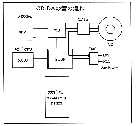 CD-DA playback is performed by reading audio data from the CD drive and setting audio output from SCSP.