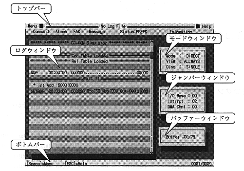 The top bar has two pull-down menus, "Menu" and "Help" ("Help" is not implemented). In the center, the log information file name specified when starting the virtual CD emulator is displayed. If no log information file is specified, "No LogFile" is displayed. Below that is a bar that shows where the information is displayed in the log window. This bar is usually purple, but it turns yellow when in LogView mode.