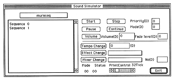 Tempo Change: Change the tempo to play. Tempo: Specify the tempo value you want to change. A positive value is faster and a negative value is slower. It is -32768-> + 32767 and doubled by 4096 (1/2 when minus). Start: Starts sounding. Stop: Stops sounding. Volume: Sets the sequence volume level and Fade in (out) speed. Fade level: Specify the Fade Level of Fade In / Fade Out. 0-> 255, 255 changes most slowly. Volume: Sets the volume. 0-> 127, 127 is the maximum volume Used in combination with Fade Level Pause: Pauses the sound. Continue: Restart from pause. Priority: Specifies the sequence priority of the sequence. 0-> 127, where 0 is the highest priority. Mode: Various modes can be set. Refer to the SATARN Sound Driver manual for details. Effect Change: Switches the DSP program. You can select from the pull-down menu. Mixer Change: Switches the Mixer. You can select from the pull-down menu. No: Sets the MixerNumber. 0->127 Mode: Shows what work the Sound Driver is currently doing. Status: Displays the current status of the Sound Driver. Print Control: Sets the Mode Status interrupt interval. It is 1Tick1 / 60 seconds from 8Tick to 200Tick. Exit: Exits Sound Simuration and closes the window.Note) Details of each control command are described in the chapter of the system interface. Please refer to .