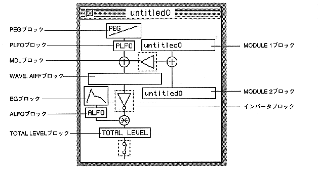 By double-clicking the block in the Slot window, you can open the parameter (PEG), PLFO, ALFO, WAVE. AIFF, inverter block, EG, SLOTOUT, MODULE1, MODULE2, and MDL windows.