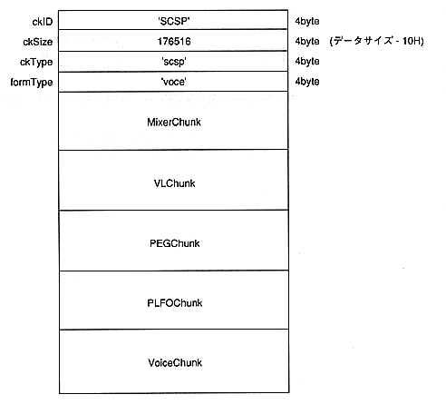 First, “SCSP” as an ID contains 4 bytes in ASCII code, and after that, the total bytes of MixerChunk and VoiceChunk are 4 bytes in long.