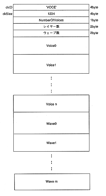 The header ID “VOCE” is 4 bytes in ASCII code, followed by 4 bytes for the total number of bytes of voice data, layer data, and wave data (PCM data). After that, the number of voices (number of tones) is entered.