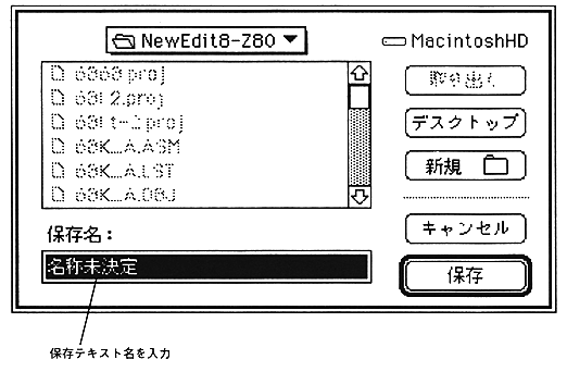 - Writes the currently edited text to a file with a name different from the window title. The standard file save dialog for Macintosh is displayed. Specify the file name in this dialog box. After saving, text editing will not be interrupted and the window will remain intact.