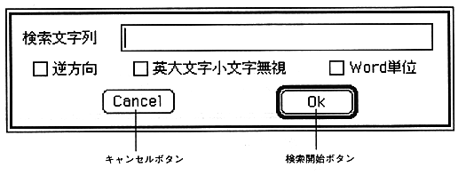 This function searches for an arbitrary character string in the active text window. The dialog below appears, and when you enter the required information, it searches for a character string that meets the conditions, and if it exists, the screen position is adjusted so that the line containing the character string falls within the display range. It is highlighted.