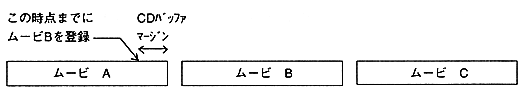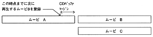 Figure 3.2 shows the case where either movie B or movie C is played after movie A playback ends. As in continuous playback 1, the branch destination is determined while the data necessary for branching remains in the CD buffer, and the movie to be played next is registered (CPK_EntryNext function). Now when movie A playback is finished, movie B or movie C will start playing seamlessly.