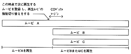 Figure 3.3 shows the case where movie A playback is interrupted and branch to movie B or movie C. When a branch condition occurs during movie A playback, the movie to be played next is registered (CPK_EntryNext function), and then the playback movie is forcibly switched (CPK_Change function). After playback of movie A is interrupted, movie B or movie C starts playing seamlessly.