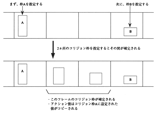 After selecting “Completion” and specifying two collision frames in another frame, the collision frame in the frame between them is automatically complemented. At this time, the action value set for the previous collision frame is also copied.