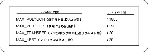 The SGL system uses 0x40000 bytes in the WORK RAM-H area for sprite and scroll control. In addition, because Gouraud shading is used when the light source affects the texture, 264 bytes of VDP1 VRAM are used as this data. The breakdown and default settings are shown below.