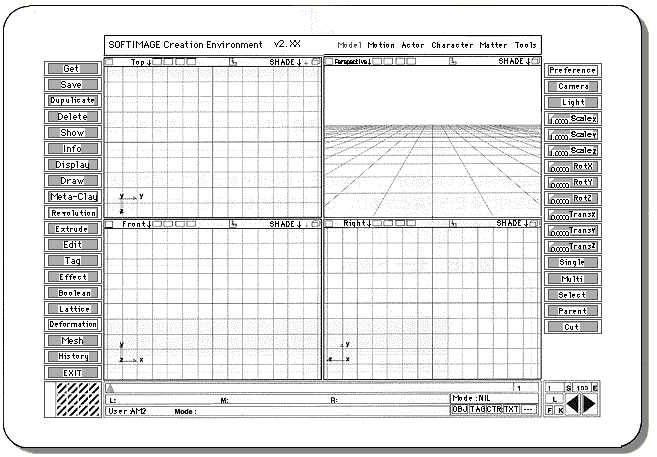 When SOFTIMAGE is started, the screen shown in the figure appears. (When SOFTIMAGE is launched for the first time, this screen appears after the screen shown in Fig. 1-4.)