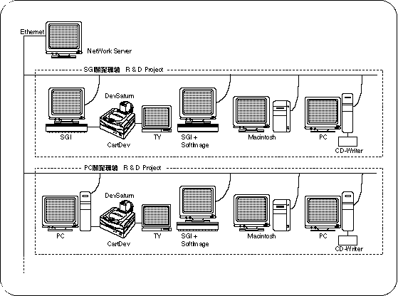 In an integrated environment using a network, it would be desirable to add SGI or PC for programmers, SGI or Macintosh for designers, and Macintosh for sound under a UNIX server.