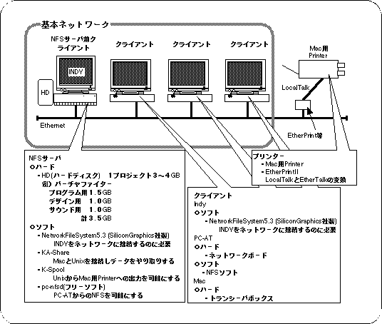 The programmer, designer, and sound development systems mentioned above can be developed more efficiently by being connected via a network. The network environment differs depending on the number of workers (number of machines). Specific network configurations (servers and clients) are described below according to the number of developers.