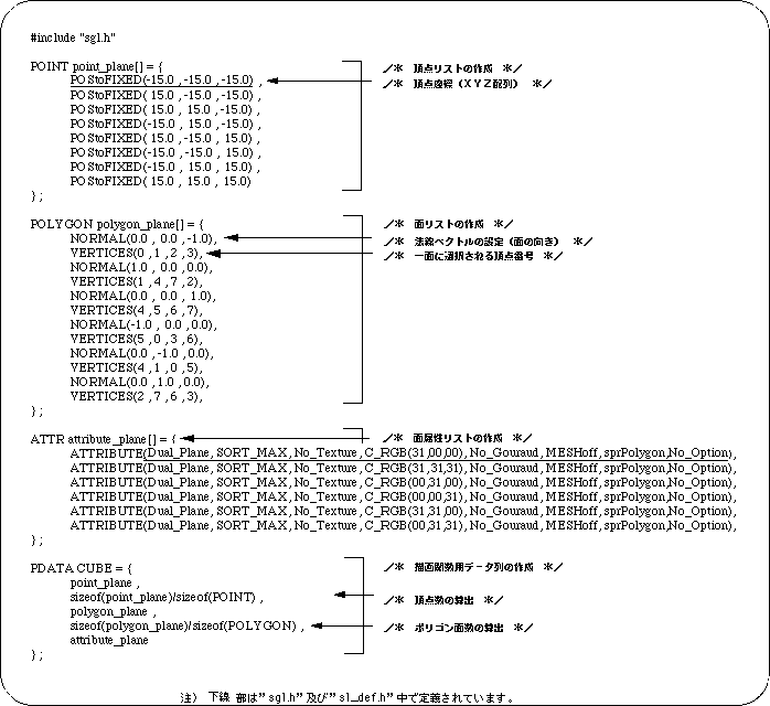 In the list, first create a list of 8 vertices that are the basis of the cube, then create a list of 6 faces from these vertices, determine the surface attributes for each face, and then send each data to the parameter data string “PD_PLANE” Store in By passing this as a polygon parameter to the drawing function “slPutPolygon”, the cube is drawn on the screen.