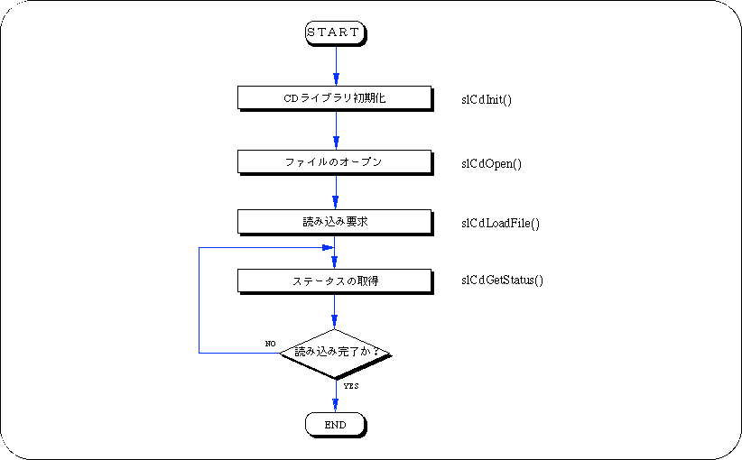 Since CD-ROM access involves a mechanical operation, the data is not read into memory at the moment when a read request is made. Also, the speed at which data is read from the CD-ROM is very low compared to the CPU speed. SGL uses a method of accessing the CD-ROM while monitoring the read status so that programs other than CD-ROM access can be executed during this waiting time.