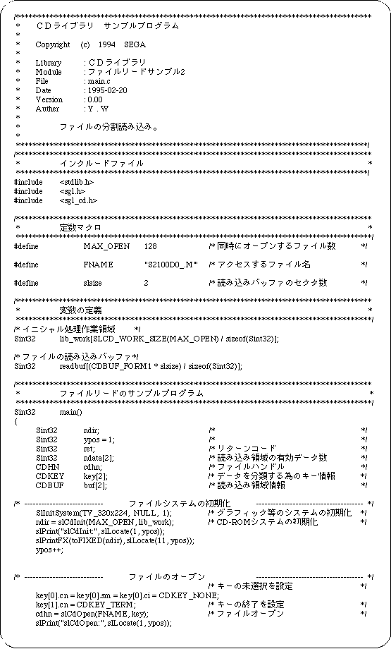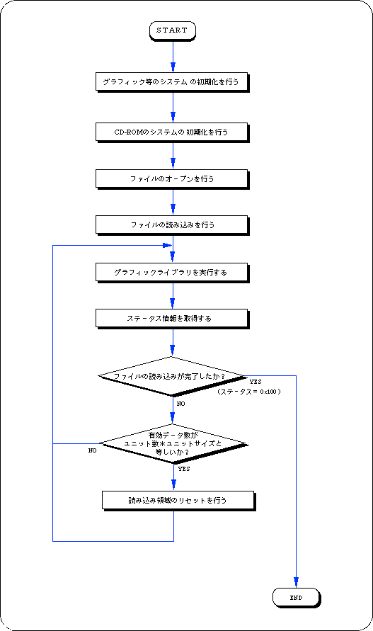 This sample program is a process for dividing and reading files on a CD-ROM, and is an example of using a basic library for reading files from a CD-ROM. The procedure is described along Flow 12-2.