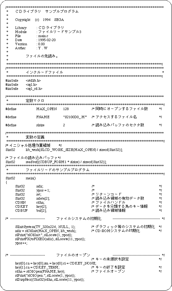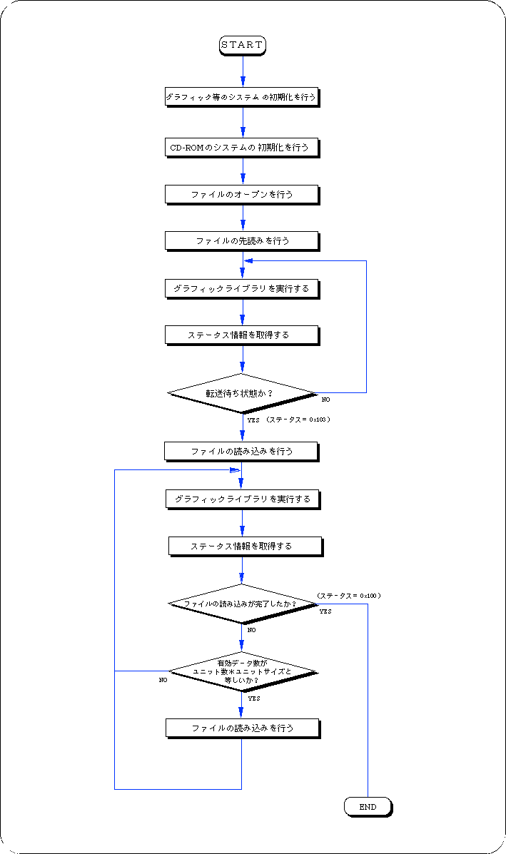 This sample program is a process for reading a file on a CD-ROM, and is a basic use example of a library process for pre-reading a file from a CD-ROM. The procedure is described along Flow 12-3.