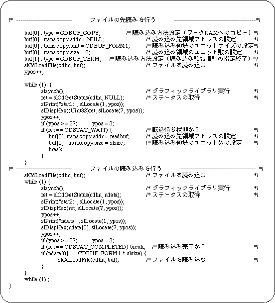 When the address of the function “slCdLoadFile” already described is set to NULL, the size of the read area is set to 0, and the return value of the function “slCdGetStatus” is “CDSTAT_WAIT”, the prefetching is completed. After this, when the address and size of the load area are set with the function “slCdLoadFile”, the transfer starts immediately. You can also set the read area address and size before pre-reading to the CD buffer is complete.