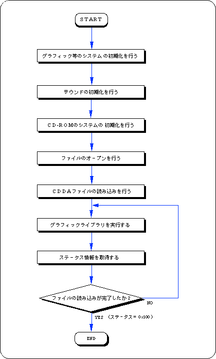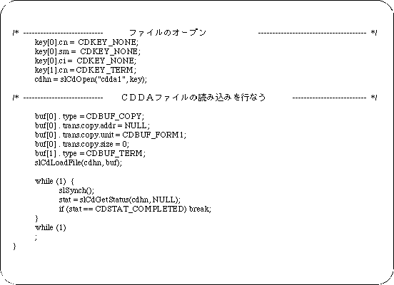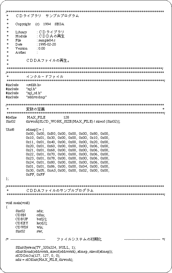 This sample program is a process for reading a CDDA file on a CD-ROM, and is an example of using a basic library for playing a CDDA file on a CD-ROM.