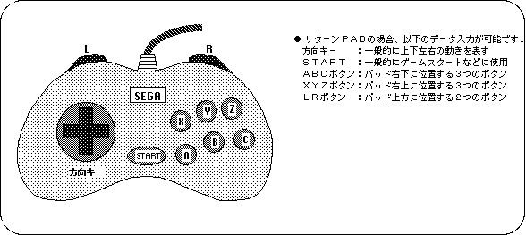 Saturn PAD is an input device composed of direction keys, start button, ABC button, XYZ button, and LR button arranged to point in 4 directions.