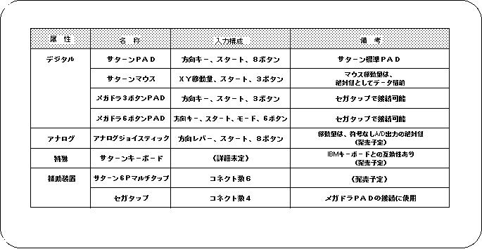 In addition to Saturn PAD, Sega Saturn supports the input devices shown in Table 9-1.
