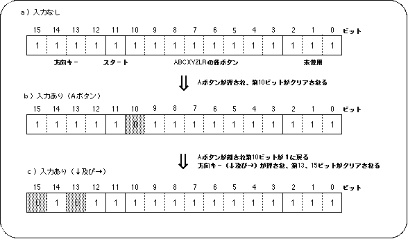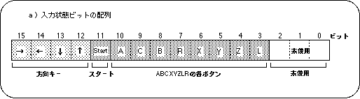 Figure 9-2 shows only the pure device status information excluding the peripheral ID part from the device information of Saturn PAD, and expanded it into a 16-bit data string (the data that SGL outputs as peripheral data is also shown) Has been expanded to this type).