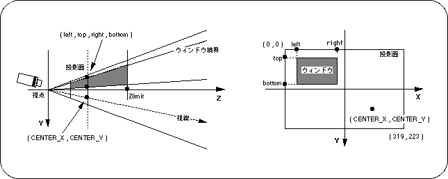 - library function slWindow sets the window area on the projection plane. Each parameter sets the screen coordinates for determining the upper left and lower right screen coordinates, the rear limit coordinates, and the line-of-sight direction of the window on the projection plane. The figure below illustrates each parameter.