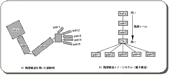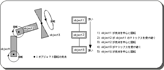 The hierarchical structure is a concept unique to 3D graphics. This is because 3D graphics deal with a vast space of 3 dimensions, and handle a large amount of parameters at once. In particular, it is necessary to handle a group of parameters that are simple but quite complicated at the same time, such as when multiple objects are related in 3D space and moved at once. That is why the idea of a hierarchical structure emerged.