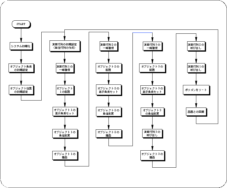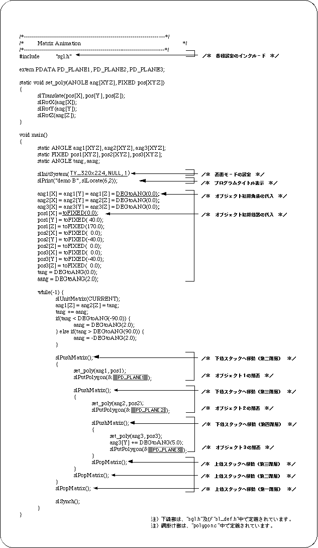 The demo program “demo_B” is a sample program for realizing animation using a hierarchical structure. In the demo, a complex movement (animation of objects with a joint structure) is easily realized by giving relationships (parent-child structure) to the three objects. This is a fairly complex and cumbersome program if you don't use the notion of hierarchical structure.