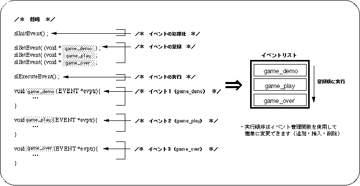 The executed event passes the value of the pointer “* next” in the EVENT structure to the EventNow variable, and the system then executes the EVENT structure starting from the address pointed to by “EventNow”. The system executes events in order according to “EventNow”, and ends event execution processing when the value pointed to by “* next” becomes NULL (there is no event to follow).
