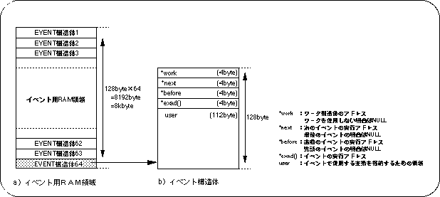 The functions registered as events and the execution order of events are processed in the event management area called the EVENT structure reserved in the event RAM area.