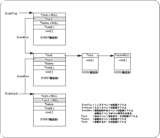 * work: Start address of WORK structure for user area expansion. * next: The start address of the next event to be executed. * before: The start address of the event executed immediately before. * exad (): Start address of the area where the function to be executed as an event is stored. user []: User area for storing variables used by event registered functions. It is also possible to expand the user area using workpieces.