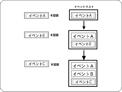 The registered events are sequentially registered at the end of the event list, and are executed in order from the top of the event list by the event execution library function “slExecuteEvent”.