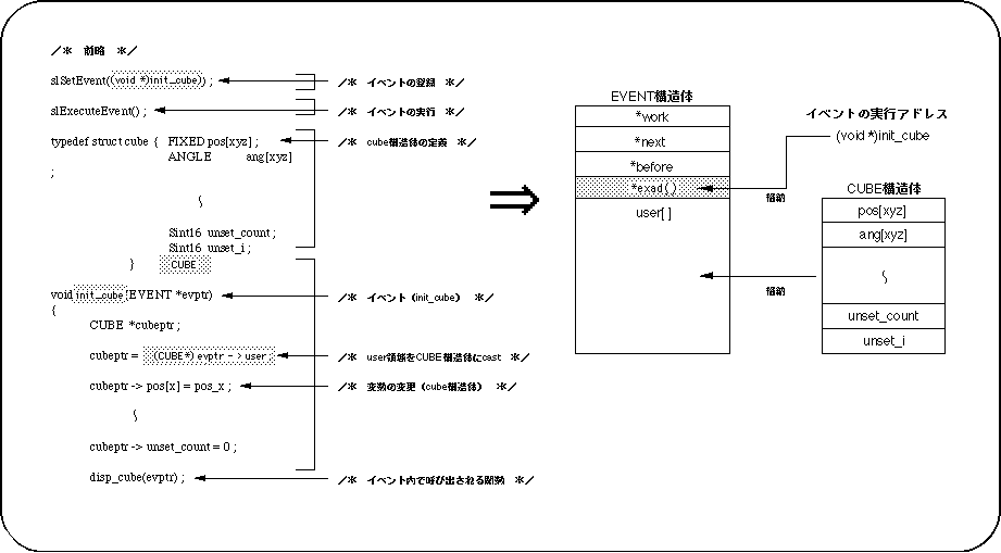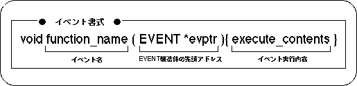 In the EVENT structure, the execution address of the event to be registered and the structure for variables used in the event are stored, and these two are used to manage the event.