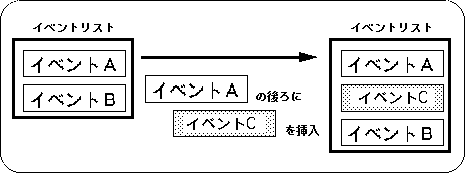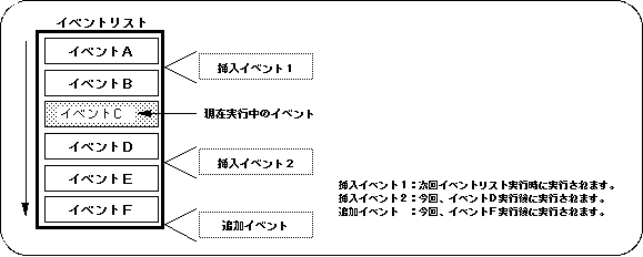 - Reserves an EVENT structure (128 bytes) in the event RAM area, and inserts / registers a new event in the middle of the event list. For the parameter, substitute the start address of the EVENT structure immediately before the event is inserted and the execution address of the event to be inserted / registered.