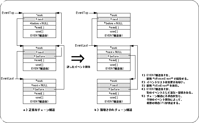 For example, if you use the library function “slReturnEvent” to execute the return / release operation of the extended user area, if you accidentally return / release the area registered as a normal event, the following adverse effects It is possible that the CPU will stop in the worst case.