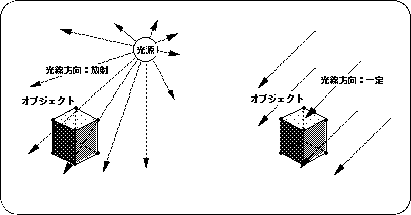 Also, with regard to the direction of light, normal light is defined as radiation from one point, which is too time consuming to calculate. Therefore, assuming that the light source position is at infinity, the light direction is always assumed to be emitted from the same direction regardless of the coordinate position of the object.