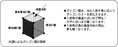 The change due to the light source on the object surface is determined by the direction of the ray and the orientation of the normal vector of each polygon face. An image of this is shown below.