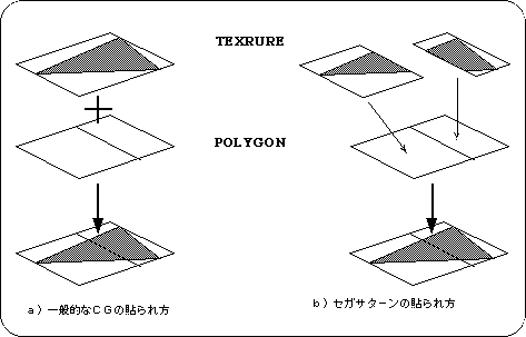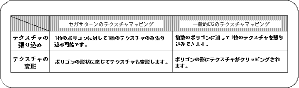Sega Saturn's texture mapping and so-called texture mapping in general CG are roughly divided into two different properties as shown in Table 7-3.