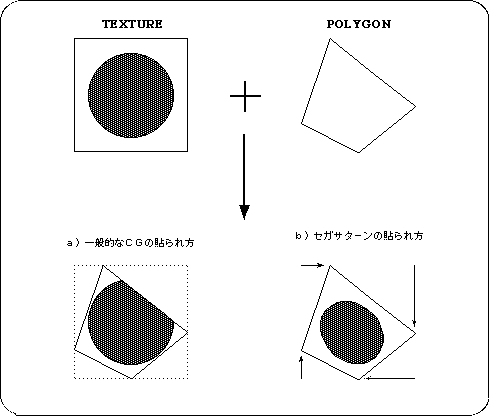 For general CG textures, if the polygon is not a rectangle (including a square), the texture is clipped to the shape of the polygon. However, in Sega Saturn, the texture is deformed along the polygon without clipping. Even if the polygon is a triangle, the entire texture is transformed into a triangle.