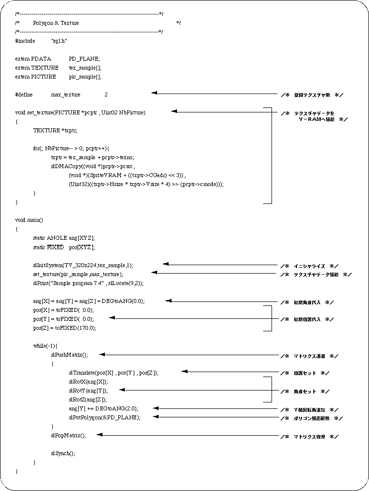 Here, the top address of the texture table and the number of registered textures are received. The “slDMACopy” function on the 18th line transfers data at high speed using DMA.