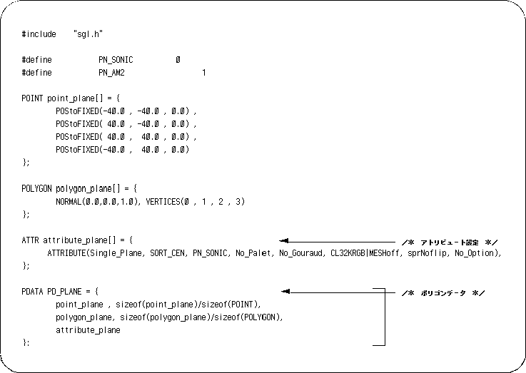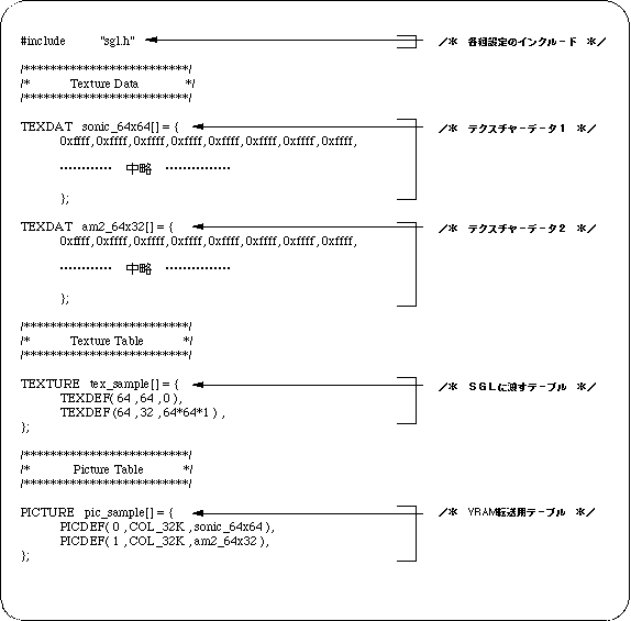 Although omitted in the above list, the source contains all the data. The texture data format is not mentioned here. Refer to “Function Reference” in the Reference Manual.