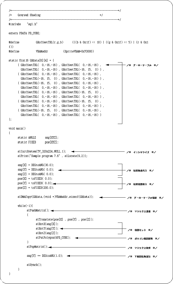 The routine itself for drawing and rotating the cube is not much different from the previous one, so I will not explain it. The difference is that line 41, the Gouraud table is being transferred to VRAM. The idea is the same as texture data transfer. First, all necessary tables are stored in VRAM.