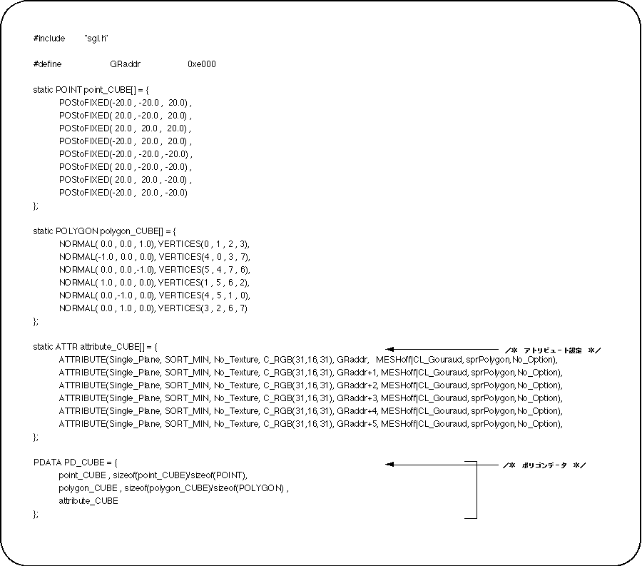 The fifth parameter “Gouraud” specifies the Gouraud table used for Gouraud shading. Gouraud shading is a term for flat shading where the boundary between polygons is clear, and is a technique that makes a polygon look like a curved surface by applying a shading process to the polygon and removing the boundary between polygons. Sega Saturn achieves Gouraud shading by using the color gradation between the vertices of the polygon.