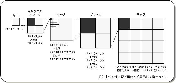 A set of 8 x 8 dot points is called a cell, and when dealing with scrolling, we will proceed with this cell as the smallest unit. These cells are gathered together to form a character pattern, and these are gathered together to create a map.