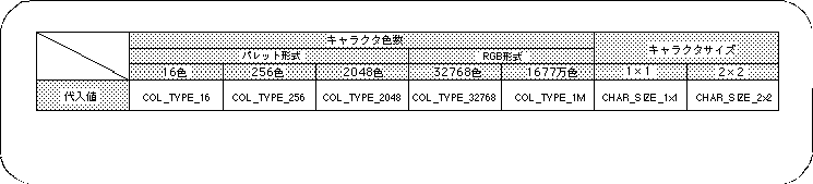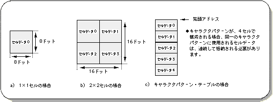 A character pattern is a square pattern composed of 1x1 cells or 2x2 cells, and stores information in dot units (information such as the drawing color of dots). In SGL, the character pattern information cluster (data table) is stored in the VRAM as character pattern data for access and use.