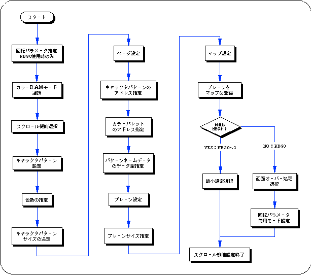 Here, the procedure for scroll setting from character pattern setting to page → plane → map setting, reduction setting, scroll registration is explained with a simple flowchart, and the scroll function setting is summarized.