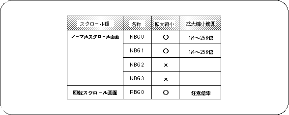 Of the five scroll screens of SEGA Saturn, the scroll scroll screen “RBG0” and the normal scroll screen “NBG0, NBG1” can be scaled up and down with respect to scrolling. Of the three scroll surfaces that can be scaled, the rotating scroll screen “RBG0” can always be scaled at any magnification, but the normal scroll screen “NBG0, NBG1” has a range of 1/4 to 256 times. You can only zoom in and out.
